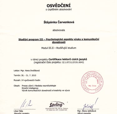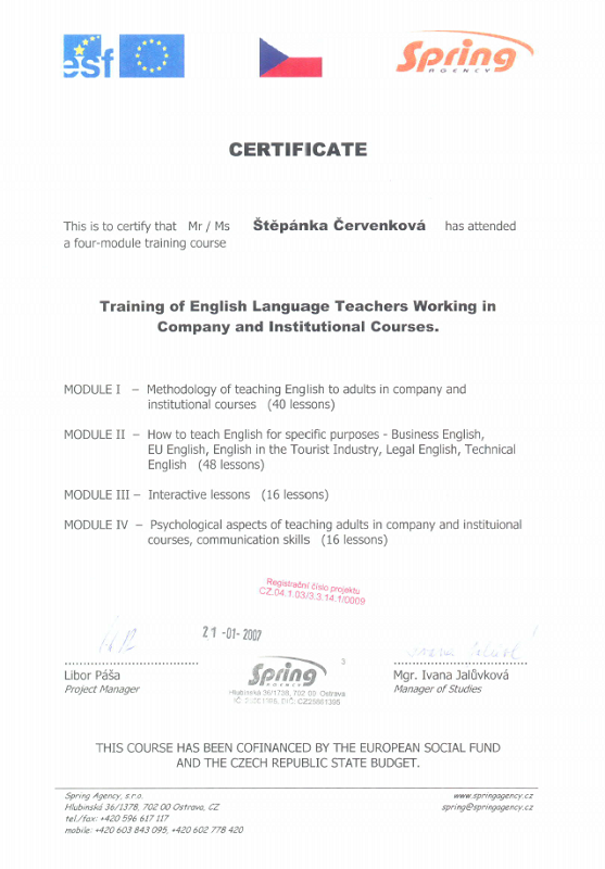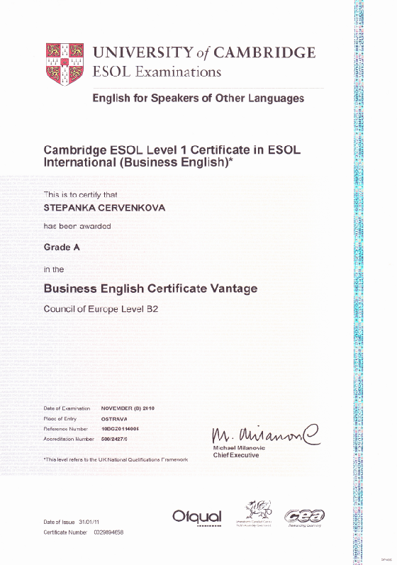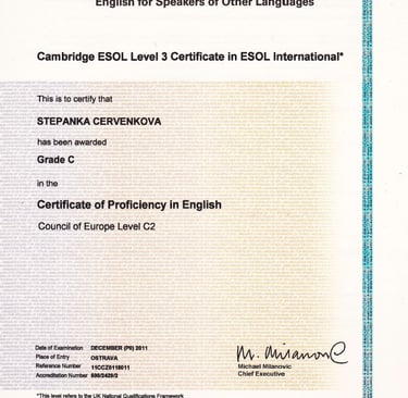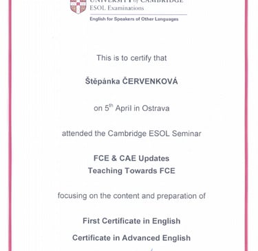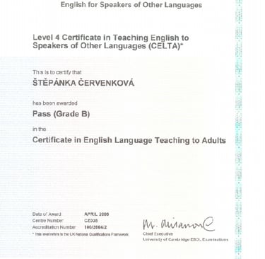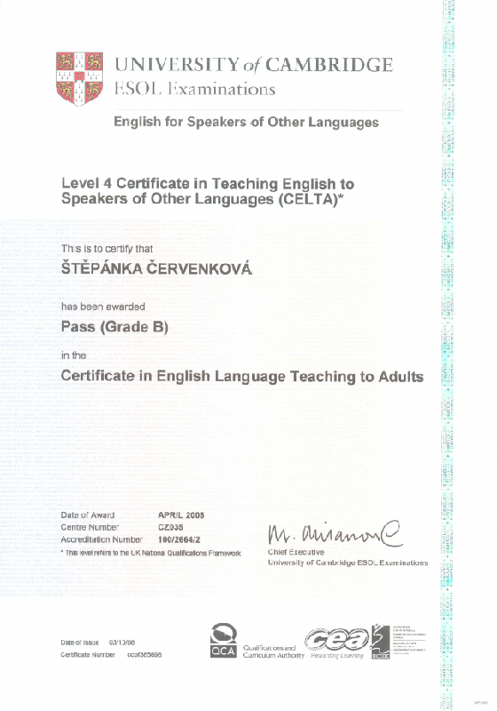 University of Cambridge) - tento certifikát mě opravňuje učit angličtinu kdekoli v zahraničí