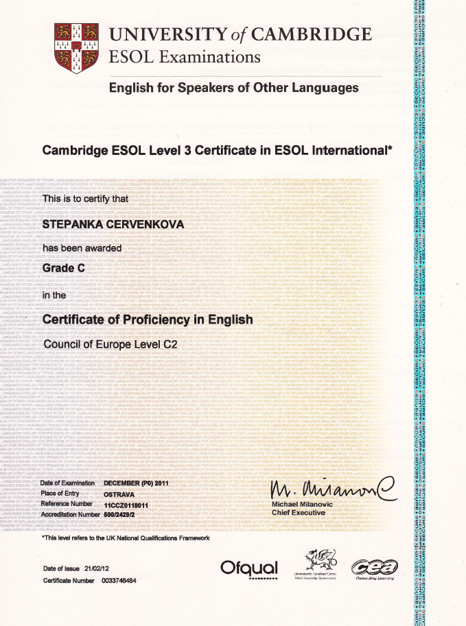 Certifikát CPE - Cambridge Proficiency Exam - level C2 - nejvyšší úroveň obecné angličtiny (Cambridge ESOL)